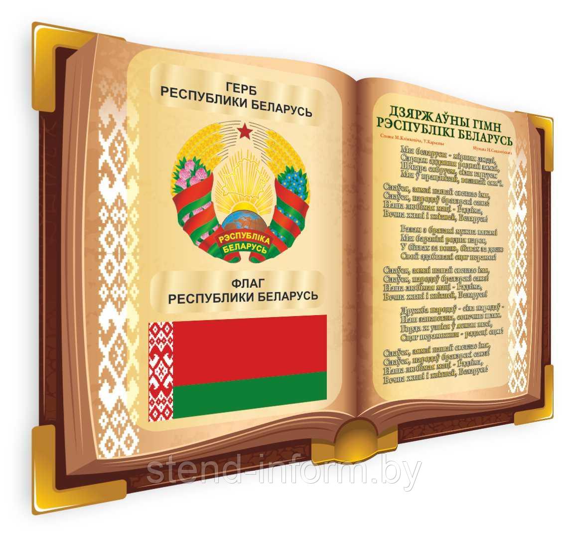 Стенд c символикой РБ р-р 55*40 см на пластике 3 мм , стенд с символикой, гербом и флагом РБ, с полноцветным изображением, выполнен на пластике с креплением для стены. Возможна любая фоновая картинка и любое
