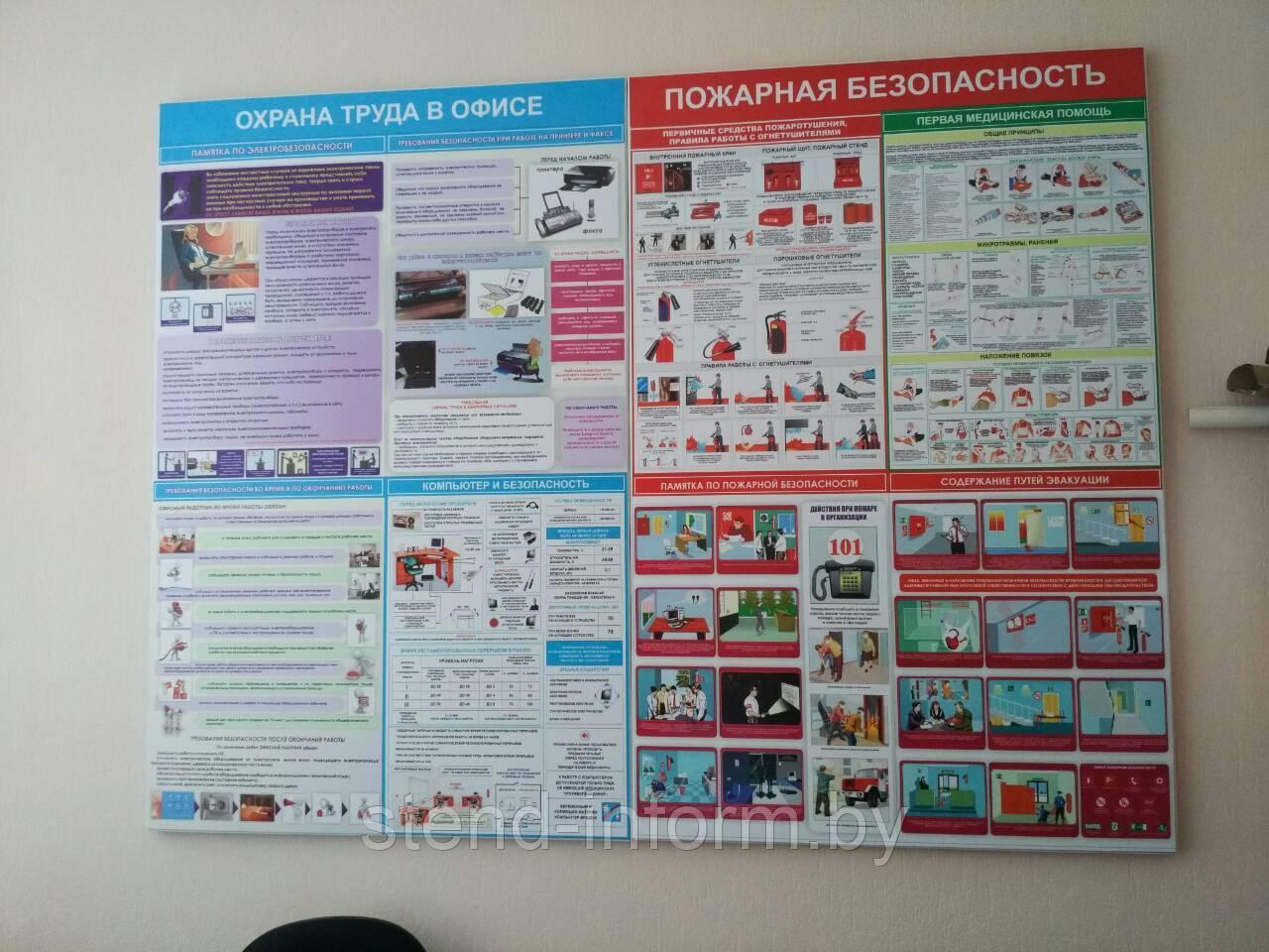Стенд "Уголок охраны труда и пожарной безопасности" для организаций р-р 120*160 см на пластике, объемный (2 см) с креплением для стены. Полноцветная печать с ламиницией.