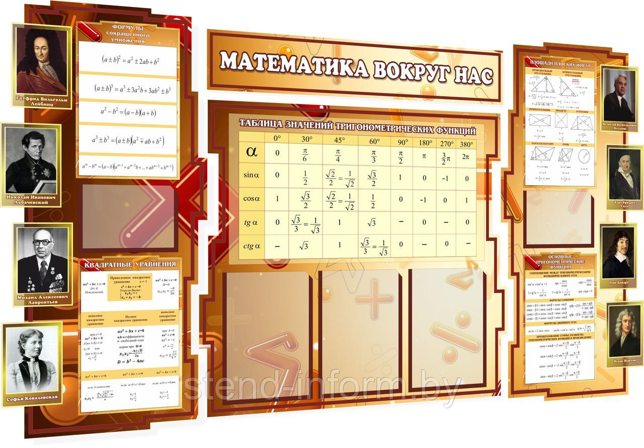 Комплекс по математике. Стенды выполнены на пластиковой жесткой основе, толщиной 3 мм. Каждый стенд и портрет оснащен скрытым металлический креплением для стены. Стенды могут быть доставлены в любой район Республики Беларусь.